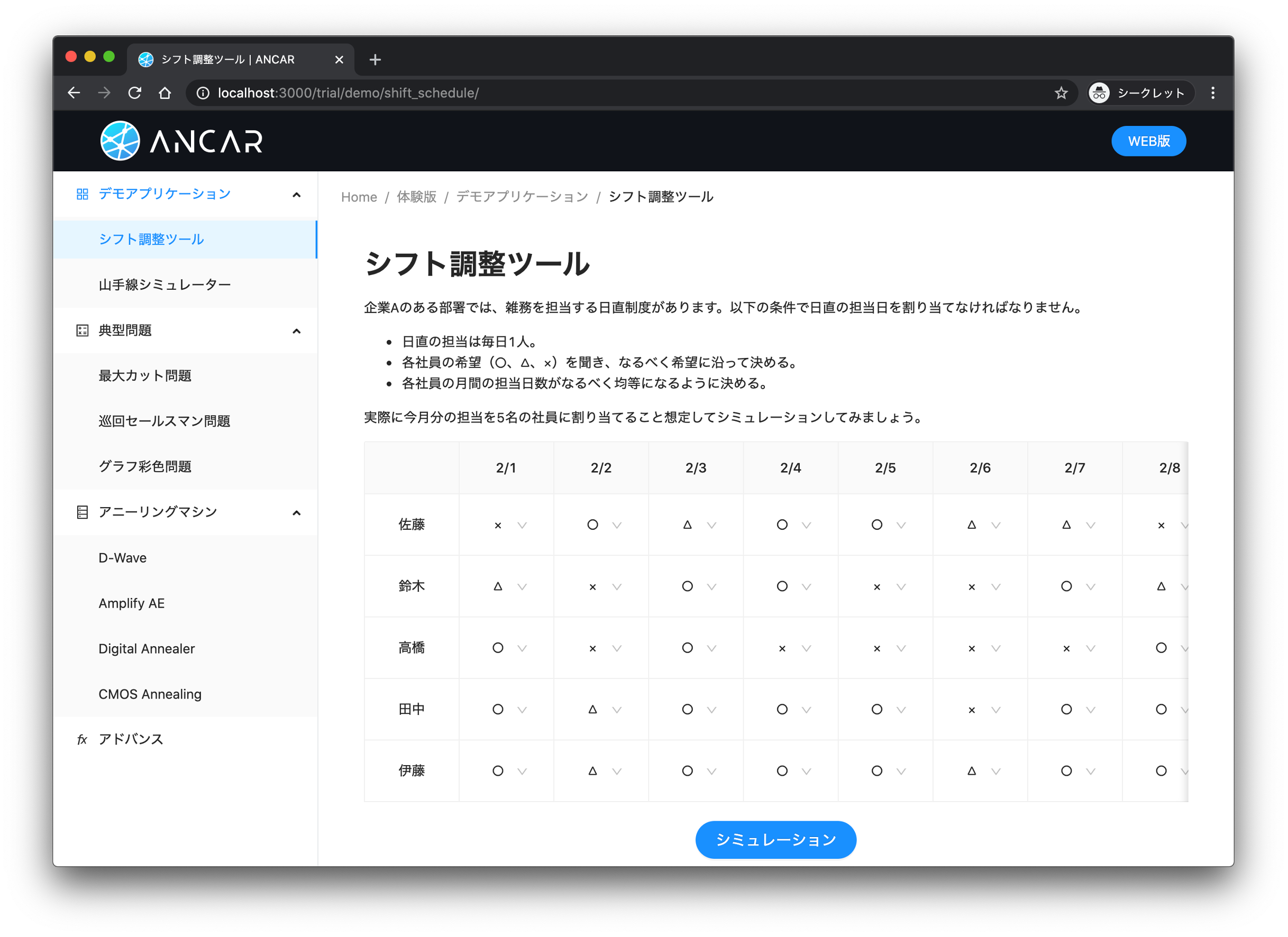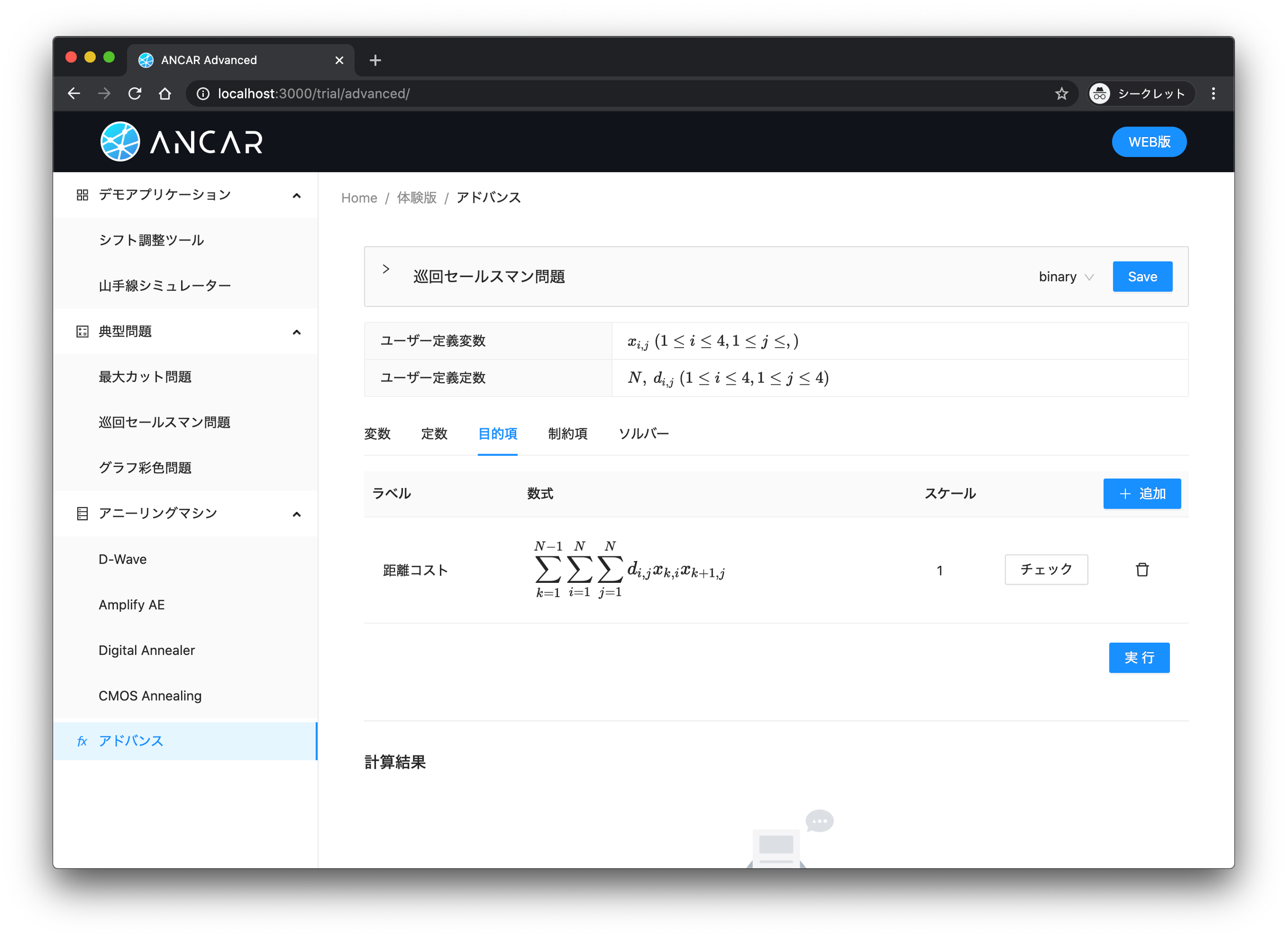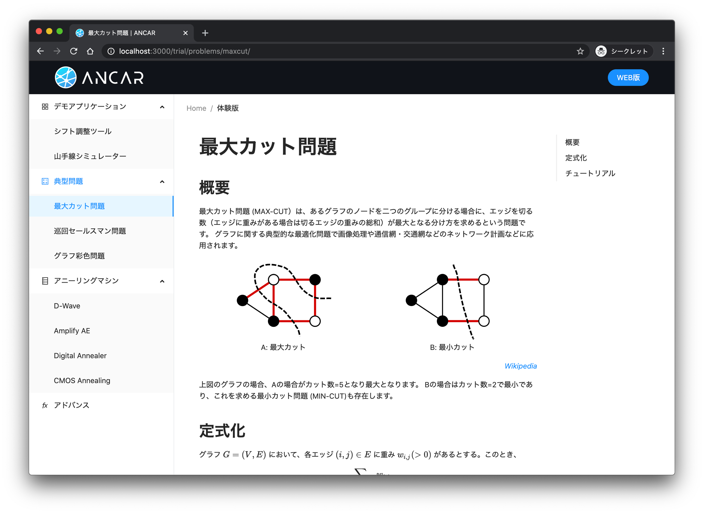 アニーリングマシンは画期的な技術ですが、その専門性の高さと周辺環境が発展途上であることから、参入障壁が高くなっており利用者がまだまだ少ないというのが現状です。 ANCARはアニーリングマシンをより手軽に扱えるコンテンツを提供し、アニーリングマシン入門のハードルを出来る限り下げること、そしてユーザーが正しく使えるようになることを目的としたアプリケーションです。