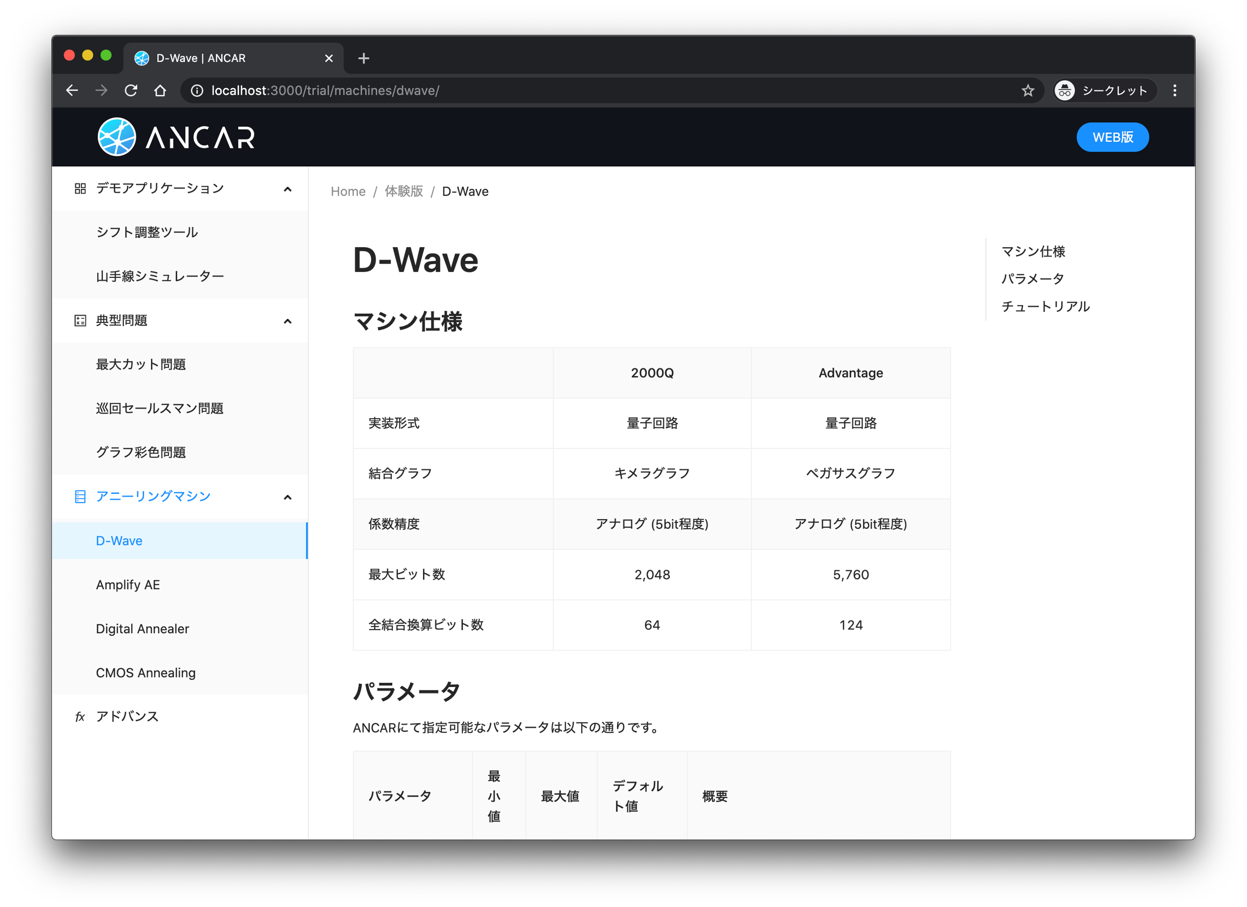 ANCARが対応しているアニーリングマシンについて、それぞれの仕様やパラメータ設定を把握できるコンテンツとなっています。